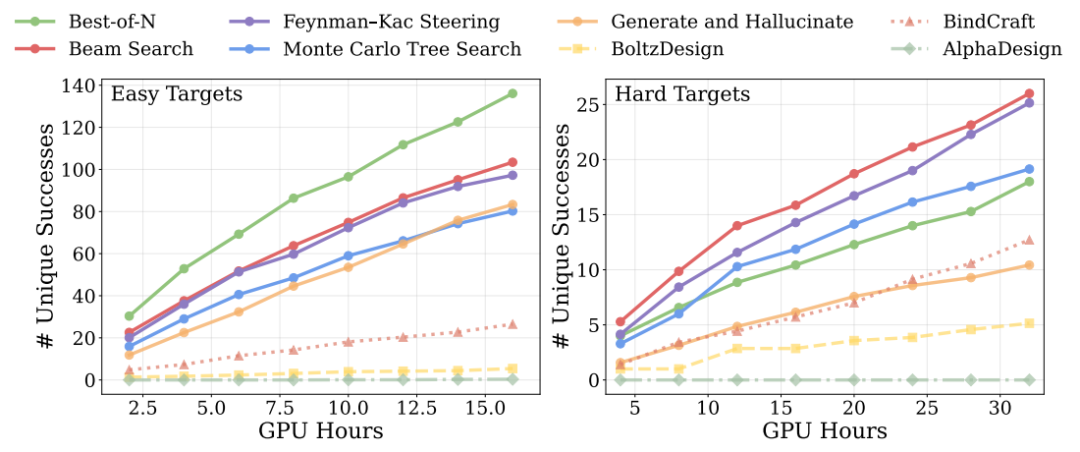 在推理阶段,Complexa 进一步引入「测试时计算扩展」机制,将生成过程与搜索优化结合起来。通过增加采样数量、引入束搜索或蒙特卡洛树搜索等方法,模型可以在更大的计算预算下持续提升生成质量。这种设计使模型能力不再完全受限于训练阶段,而可以在推理过程中动态扩展。