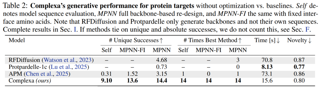 在基础生成能力上,无论是蛋白质靶点还是小分子靶点任务,Complexa 均显著优于现有方法,不仅成功率更高、采样速度更快,同时生成结构的新颖性也明显提升。更重要的是,模型可以直接输出高质量序列,无需依赖 ProteinMPNN 等工具进行二次设计,从而简化了整体流程。