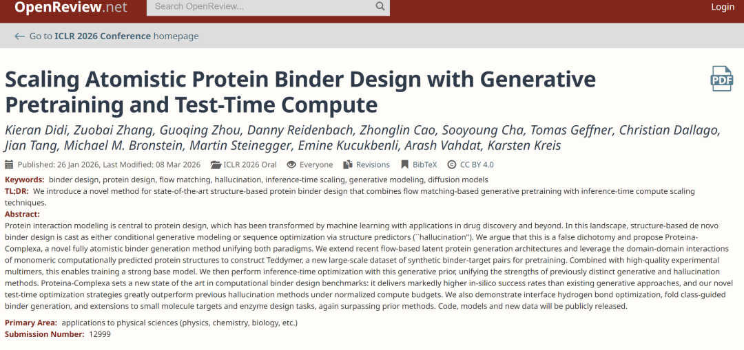 相关研究成果以「Scaling Atomistic Protein Binder Design with Generative Pretraining and Test-Time Compute」为题,已入选 ICLR 2026 。