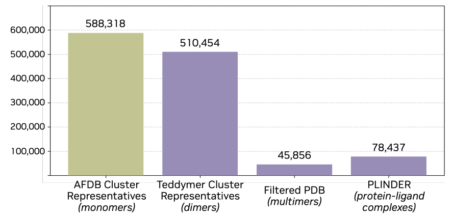 在训练过程中,如下图所示,研究并未依赖单一数据源,而是将 AFDB 单体、 Teddymer 构造数据、 PDB 实验复合体以及 PLINDER 蛋白-配体数据进行整合,使模型能够在单体结构、复合体结构与小分子相互作用之间建立统一表示,从而兼顾生成能力与泛化能力。