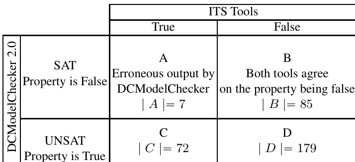 作者使用 DCModelChecker 2.0 验证 LTLFireability 性质并与 ITS-Tools 对比,通过比较两者对假性质结果一致或 DCModelChecker 2.0 返回反例的情况,达到 0.90 的工具置信度。结果表明,DCModelChecker 2.0 在大多数情况下正确识别假性质,但当 ITS-Tools 报告为真时会产生一些错误输出。该工具的 2D-BMC 策略不完备,如 UNSAT 结果可能在更高边界下变为假。