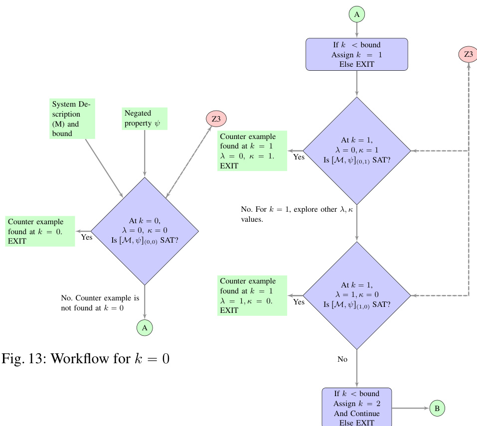 工作流始于将性质 ϕ 否定为 ψ 并初始化边界 k=0。对每个 k,迭代所有和为 k 的 (λ,κ) 对,构建相应 SMT 公式并查询 Z3。搜索持续至找到反例或达到外部终止边界。此系统性探索确保在有界状态空间内全面验证。