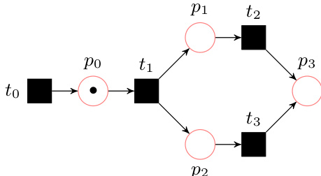 建模始于标准 Petri 网形式化:一个三元组 N=(P,T,F),其中 P 是位置集合,T 是迁移集合,F 是定义带可选权重的有向弧的流函数。标记 M:P→N0 表示网的状态,指示各位置上的令牌分布。迁移根据启用规则触发:迁移 t 在标记 M 下启用,当且仅当对所有 p∈P,有 M(p)≥preN(t,p)。触发后,后继标记 M′ 按公式 M′(p)=M(p)−F(p,t)+F(t,p) 对所有 p∈P 计算。可达图记录从初始标记 M0 出发的所有可能状态转移。
