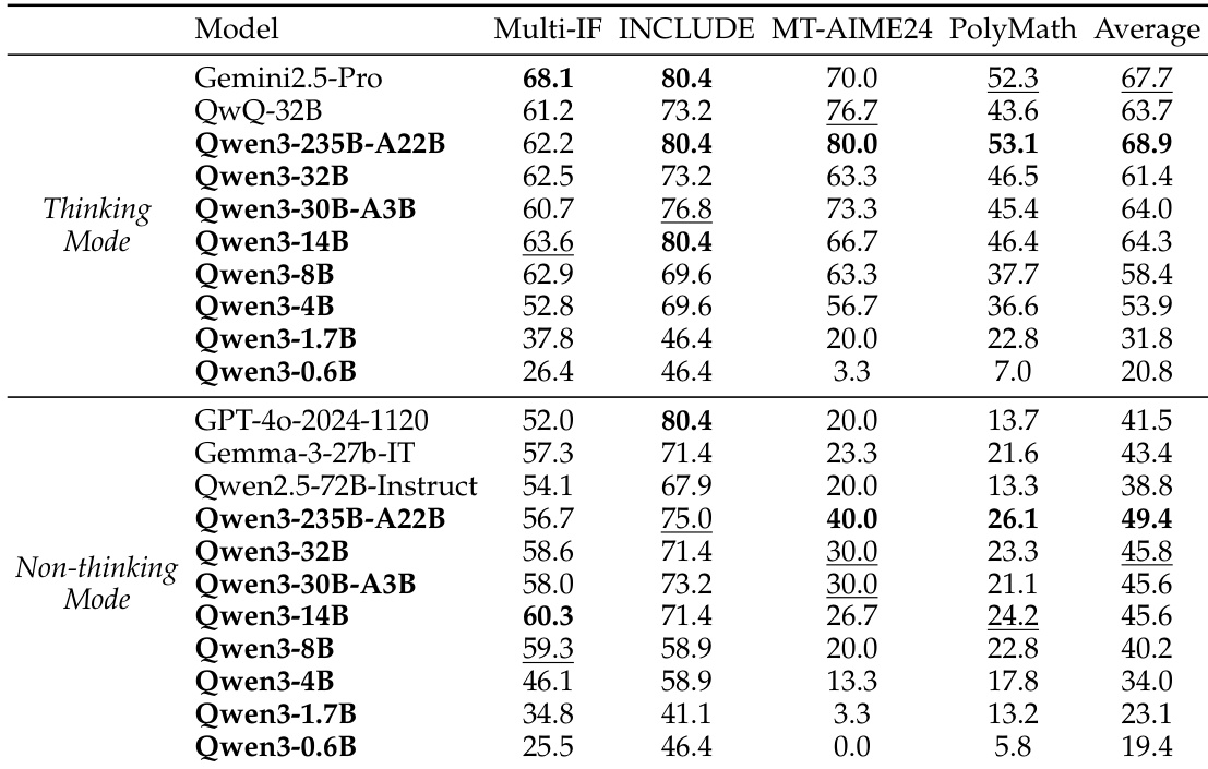 下表评估了 Qwen3 模型与强大基线在多语言和数学推理能力方面的表现。旗舰模型 Qwen3-235B-A22B 在思考和非思考模式下均取得了最高的平均分数。启用思考模式与不启用思考的配置相比,始终提高了所有模型规模的性能。Qwen3-235B-A22B 在两种模式下均以最高平均分数领先评估。激活思考模式显著提升了数学和多语言基准测试的性能。Qwen3 模型在所有方面均优于前几代和竞争的开源模型。