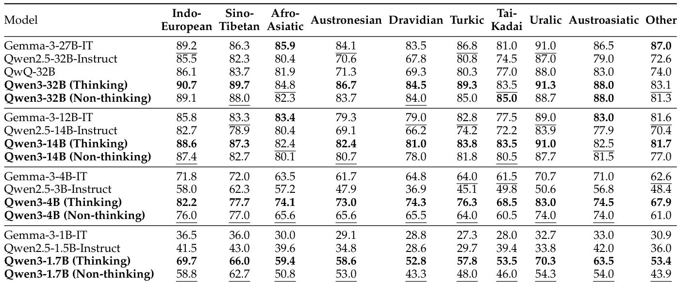 作者展示了 Qwen3 模型在不同语系上的评估结果。数据显示,Qwen3 模型,特别是在思考模式下,与 Qwen2.5 和 Gemma-3 基线相比始终取得更优越的性能。思考模式下的 Qwen3-32B 在几乎所有语系中均领先性能。Qwen3 模型在性能上优于规模相似或更大的 Qwen2.5 和 Gemma-3 基线。思考模式变体的得分通常高于非思考版本。