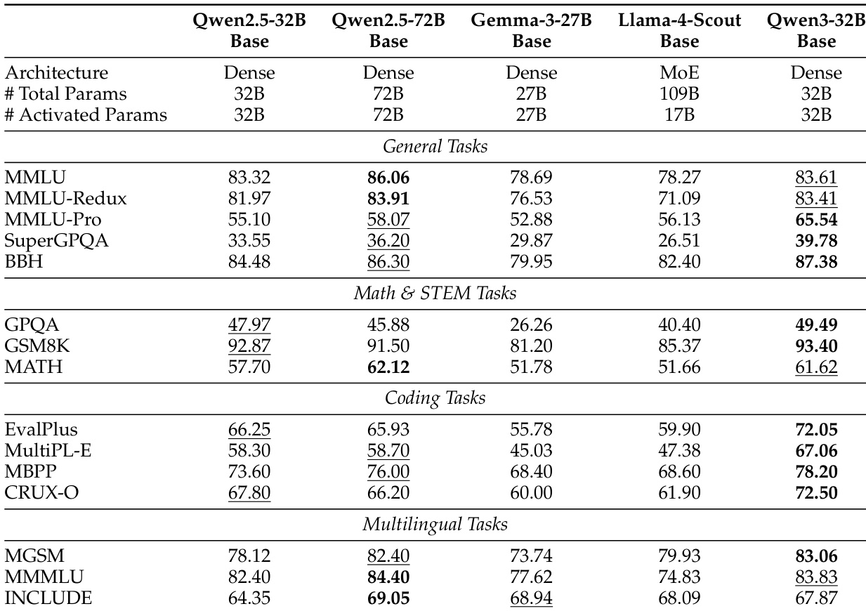 作者将 Qwen3-32B 基础模型与之前的 Qwen2.5 版本以及其他领先的开源模型(包括 Gemma-3 和 Llama-4-Scout)进行了比较。结果表明,Qwen3-32B 基础模型在通用、数学、代码和多语言任务上均取得了优越的性能,经常超越更大的模型如 Qwen2.5-72B 基础模型。Qwen3-32B 基础模型在大多数基准测试中优于更大的 Qwen2.5-72B 基础模型,尽管其参数更少。该模型在代码和 STEM 任务中表现出卓越的能力,在 EvalPlus 和 GSM8K 中取得了最高分数。它在所有评估任务中显著超过了基于 MoE 的 Llama-4-Scout 基础模型的性能。