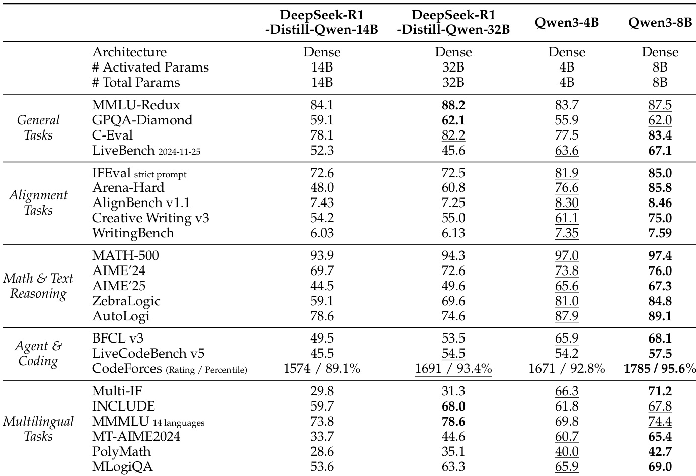 作者将 Qwen3-4B 和 Qwen3-8B 与思考模式下的 DeepSeek-R1 蒸馏模型进行了比较,发现较小的 Qwen3 模型在大多数基准测试中取得了更优越的性能。这证明了强到弱蒸馏方法在增强轻量级模型能力方面的有效性。Qwen3-8B 在通用和推理任务上的得分高于更大的 DeepSeek-R1-Distill-Qwen-32B。Qwen3-4B 在对齐和多语言基准测试中优于 DeepSeek-R1-Distill-Qwen-14B。在数学和代码任务中观察到 Qwen3 模型具有显著的性能优势。