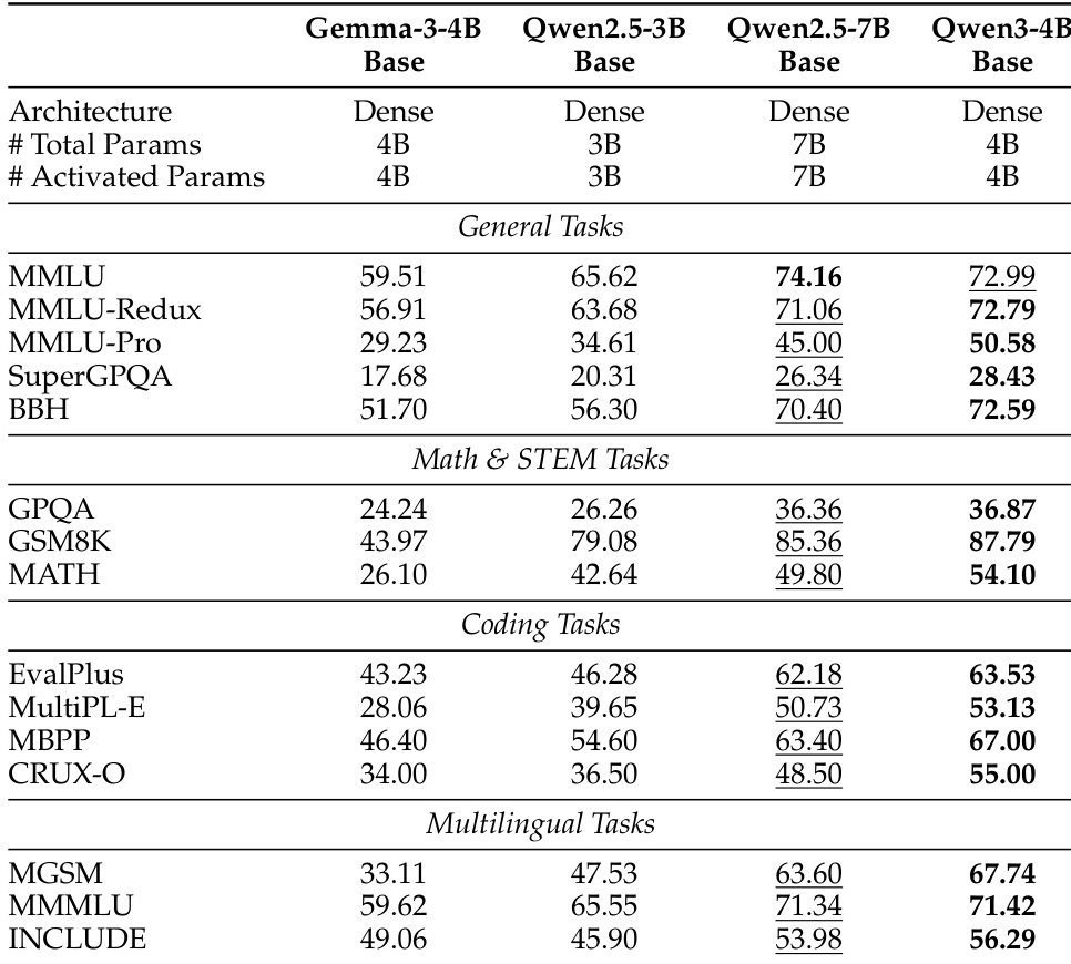 下表将 Qwen3-4B 基础模型与 Gemma-3-4B 和 Qwen2.5 系列模型在各种基准测试中进行了比较。结果表明,Qwen3-4B 模型达到了与更大的 Qwen2.5-7B 基础模型相当的性能水平,同时显著优于较小的 Qwen2.5-3B 基础模型。Qwen3-4B 匹配或超过了更大的 Qwen2.5-7B 模型的性能。该模型显示出比较小的 Qwen2.5-3B 变体实质性的改进。尽管尺寸较小,但在代码和 STEM 基准测试中仍取得了强劲的结果。