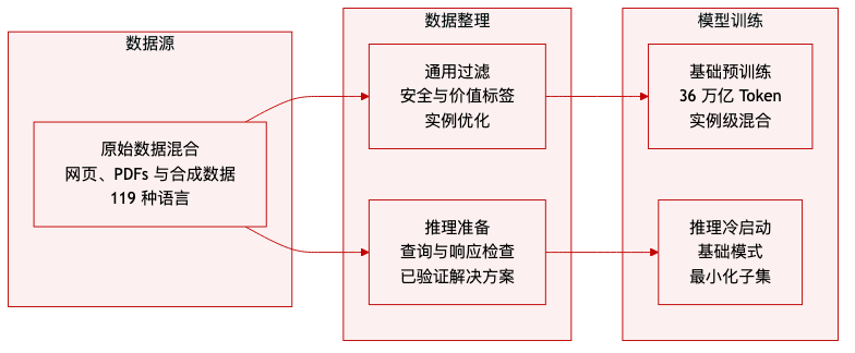 - 训练策略:预训练数据支持基础模型开发,并进行实例级别混合优化。冷启动阶段使用最小化的样本子集来灌输基础推理模式,同时为后续的强化学习保留灵活性。