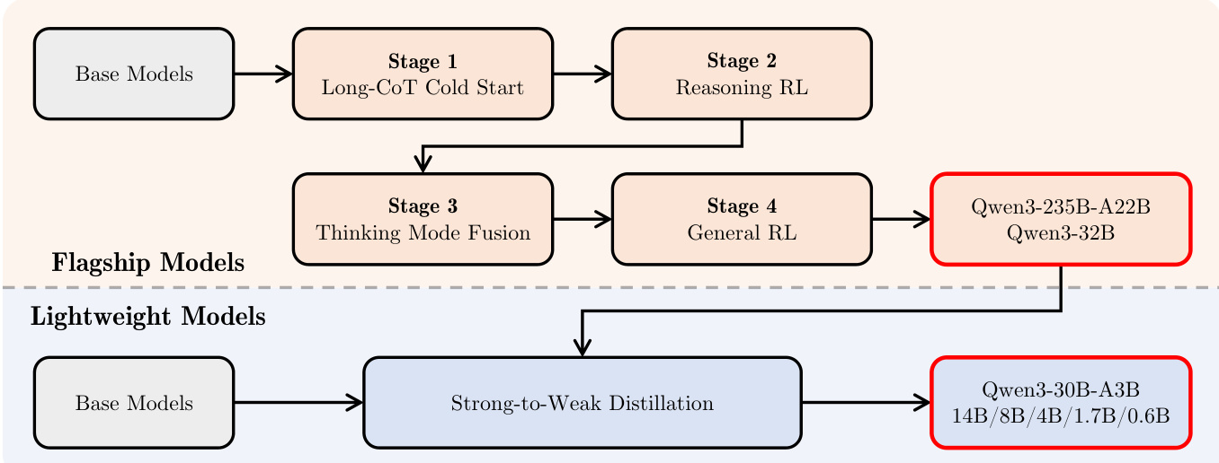 旗舰模型经过复杂的四阶段流程。阶段 1 和 2 通过长思维链冷启动和推理强化学习专注于开发推理能力。阶段 3,思考模式融合,通过持续监督微调将非思考功能整合到推理模型中。该阶段引入了带有 /think 和 /no_think 标志的特定聊天模板,允许用户动态控制推理过程。此外,这种融合实现了涌现的预算控制,模型可以在达到 token 阈值时停止思考。阶段 4 应用通用强化学习,通过多层面奖励系统扩展指令遵循、格式遵守和智能体交互等方面的能力。