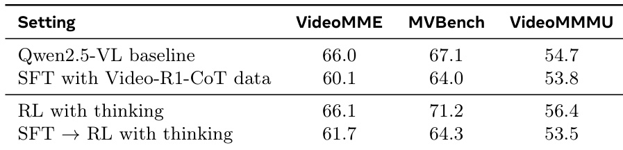 作者在 Qwen2.5-VL 基线模型上比较不同训练策略,显示使用 Video-R1-CoT 数据进行直接 SFT 会降低所有基准测试的性能。带思考的 RL 在感知与推理任务上优于基线,而 SFT → 带思考的 RL 方法在 VideoMME 与 MVBench 上表现最佳,但在 VideoMMMU 上表现较差。