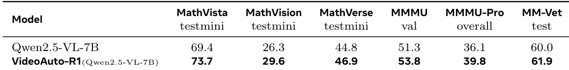 作者使用基于 Qwen2.5-VL-7B 的 VideoAuto-R1 模型,在图像推理基准测试中评估其性能。结果表明,VideoAuto-R1 在所有测试基准上均优于 Qwen2.5-VL-7B 基线,准确率提升范围从 MathVista 的 4.3% 到 MM-Vet 的 10.9%,证明其自动推理机制在推理任务中的有效性。