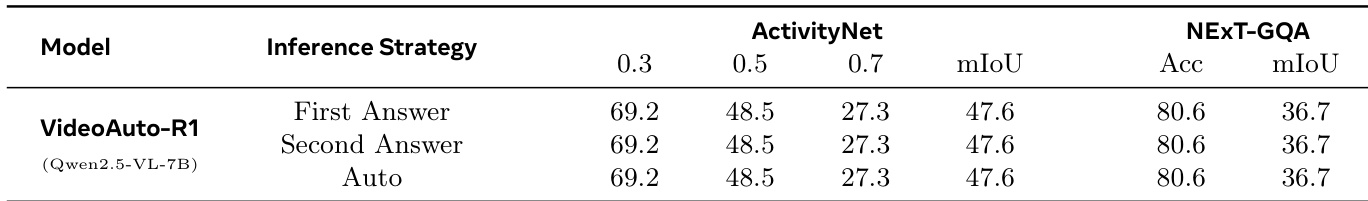 结果表明,VideoAuto-R1 在时序定位基准测试中对不同推理策略表现出一致性能,第一答案与第二答案在 mIoU 或准确率上无显著差异。模型的基于置信度的早期退出机制能有效选择初始答案而无需进一步推理,在保持高准确率的同时提升推理效率。