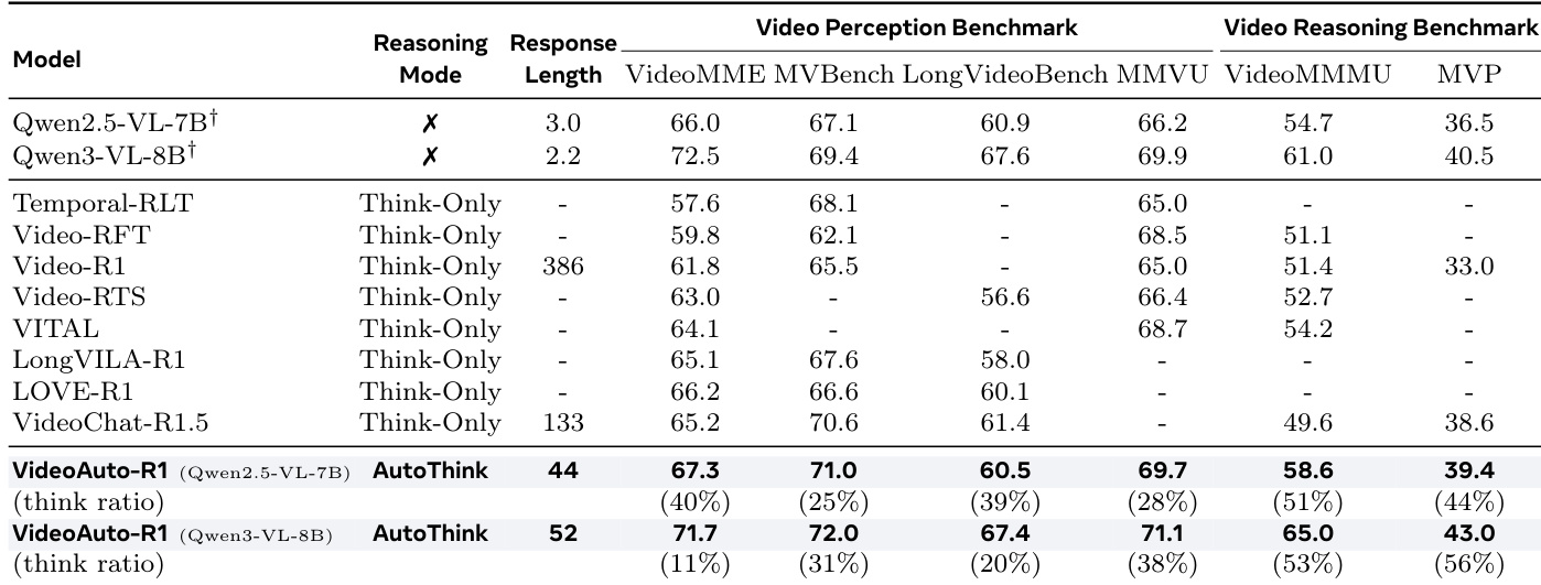 作者使用 VideoAuto-R1 模型,该模型基于置信度自适应触发推理,实现了在感知与推理类视频问答基准测试中的最先进结果。结果表明,VideoAuto-R1 在推理密集型任务(如 VideoMMMU 和 MVP)上显著优于现有仅思考模型,同时保持更短的平均响应长度,证明其高效性与有效性。