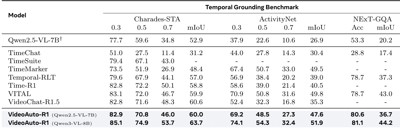 结果表明,VideoAuto-R1 在时序定位基准测试中达到最先进性能,超越 Time-R1 和 VITAL 等先前模型,在多个指标上表现更优。模型的初始框式预测已足够实现准确定位,进一步推理仅提供解释性价值,未提升性能,支持使用早期退出以增强推理效率。