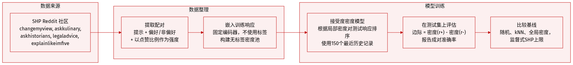 该模型称为“接受密度”,计算首选和非首选响应之间的成对边际,并报告边际为正的概率作为准确率。性能与基线进行比较:随机分配、kNN 多数投票、全局密度估计和原始监督 SHP 奖励模型(作为上限)。
