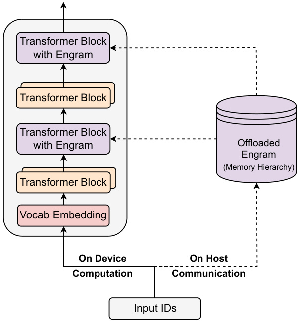 该设计使 Engram 能够扩展到极大的记忆规模,同时对实际推理延迟影响极小。