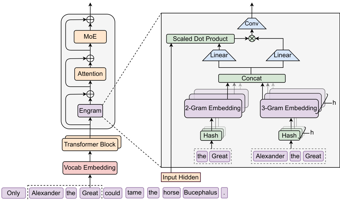 Transformer 模型通常通过大量计算来“模拟”知识检索过程,导致早期层的容量被浪费在重构诸如命名实体、固定搭配或公式化短语等静态模式上。以往方法要么将 N-gram 查找作为外部增强机制,要么仅在输入层引入嵌入,难以在像 MoE 这样以稀疏计算为核心的架构中高效融合。