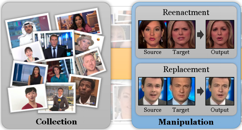 This is a forensics dataset that uses four automatic face-changing algorithms: Face2Face, FaceSwap, DeepFakes, and NeuralTextures to process 1,000 real video sequences.