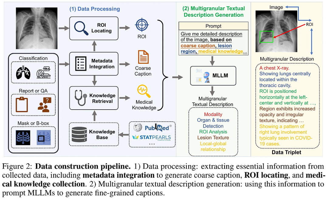 MedTrinity-25M contains more than 25 million medical images, covering 10 imaging modes, and more than 65 diseases are annotated. This dataset not only contains rich global and local annotations, but also integrates multi-level information annotations in multiple modalities (such as CT, MRI, X-ray, etc.). These annotations include disease or lesion type, imaging modality, region-specific descriptions, and relationships between organs. By preprocessing and integrating data from more than 90 different sources, the research team developed a unique automated data construction process for generating multi-level visual and text annotations. This method breaks through the traditional limitations of relying on paired images and texts and realizes the automatic generation of annotations. This dataset will provide great support for multimodal tasks such as medical image processing, report generation, classification, and segmentation, while promoting the pre-training of medical-based artificial intelligence models.