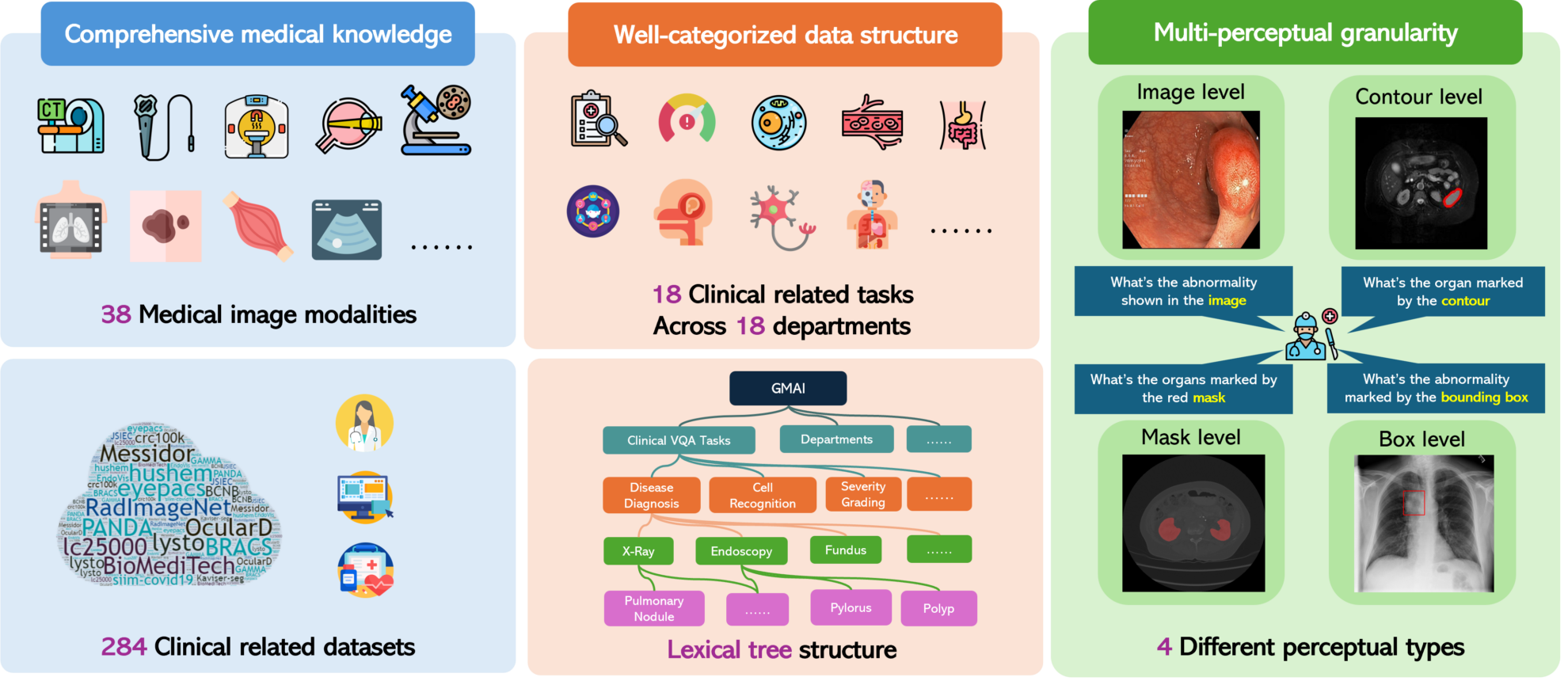 GMAI-MMBench is a multimodal evaluation benchmark designed to promote the development of general medical artificial intelligence. It was jointly launched in 2024 by nine institutions including Shanghai Artificial Intelligence Laboratory, University of Washington, Monash University, East China Normal University, University of Cambridge, Shanghai Jiao Tong University, The Chinese University of Hong Kong (Shenzhen), Shenzhen Institute of Big Data, and Shenzhen Institute of Advanced Technology, Chinese Academy of Sciences.GMAI-MMBench: A Comprehensive Multimodal Evaluation Benchmark Towards General Medical AI". It helps researchers and developers gain in-depth understanding of the application effects of large visual language models (LVLMs) in the medical field and identify technical shortcomings by providing comprehensive and detailed evaluations. This benchmark covers a wide range of datasets, including 284 datasets from different sources, involving 38 medical image modalities and 18 clinically relevant tasks, covering 18 different medical departments, and evaluated at 4 different perceptual granularities, thereby considering the performance of LVLMs from multiple dimensions.