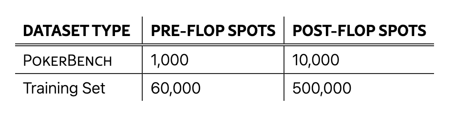 PokerBench is a poker game evaluation dataset developed by a research team from the University of California, Berkeley and Georgia Institute of Technology in 2025. It aims to evaluate the performance of large language models (LLMs) in complex, strategic poker games.PokerBench: Training Large Language Models to become Professional Poker Players". The dataset contains 11k key scenarios, divided into 1k pre-flop and 10k post-flop scenarios, covering a wide range of game situations.