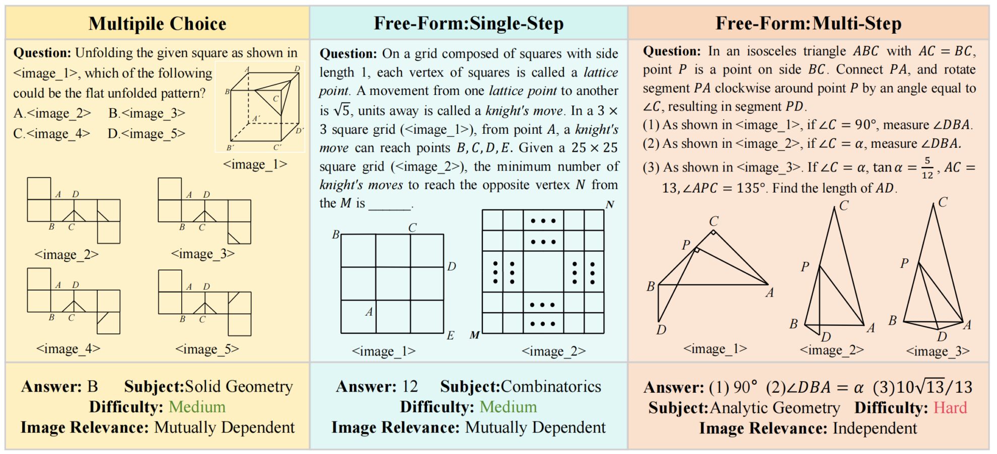 The MV-MATH dataset contains 2,009 high-quality math problems, and the types of questions are divided into three categories: multiple-choice questions, fill-in-the-blank questions, and multi-step questions. The dataset contains multiple visual scenes, and each question is accompanied by 2 to 8 images. These images are intertwined with text to form complex multi-visual scenes, which are closer to mathematical problems in the real world and can effectively evaluate the model's reasoning ability to process multi-visual information. Secondly, the dataset is very rich in annotations. Each sample has been cross-validated by at least two annotators. The annotations cover questions, answers, detailed analysis, and image correlation, providing detailed information for model evaluation. In addition, the dataset covers 11 mathematical fields from basic arithmetic to advanced geometry, including analytic geometry, algebra, metric geometry, combinatorics, transformation geometry, logic, solid geometry, arithmetic, combinatorial geometry, descriptive geometry, and statistics. According to the length of the detailed answers, the dataset is also divided into 3 difficulty levels, which can comprehensively evaluate the model's reasoning ability in different mathematical fields. It is worth mentioning that this dataset introduces the feature label of image correlation for the first time, dividing the dataset into two subsets: Mutually Dependent Set (MD) and Independent Set (ID). In the MD subset, images are interrelated, and understanding an image requires reference to other images; while in the ID subset, images are independent and can be interpreted separately.