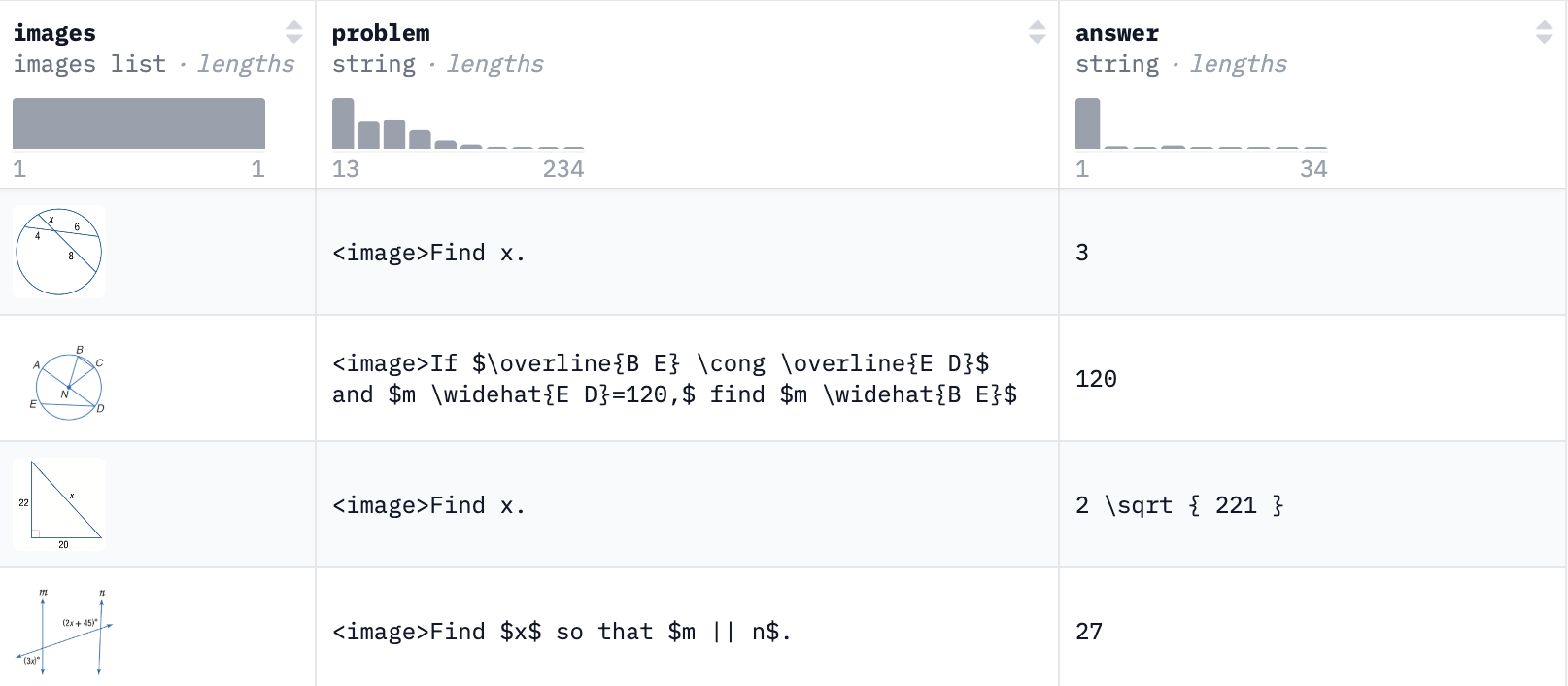 This dataset describes a rich variety of geometric problems, such as solving angles, side lengths, areas, perimeters, etc., with a total of 6293 text items.