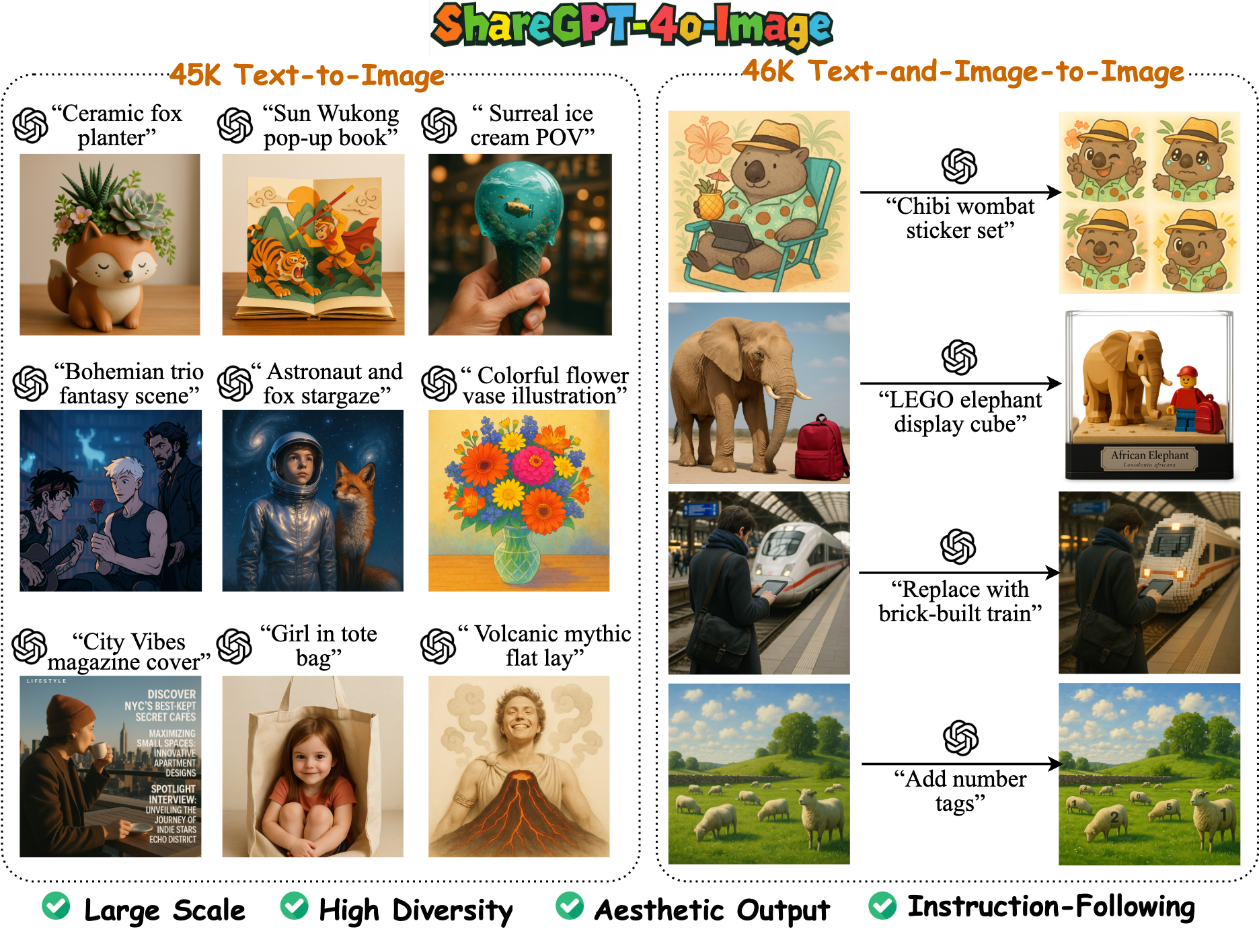 ShareGPT-4o-Image is a large-scale, high-quality image generation dataset.ShareGPT-4o-Image: Aligning Multimodal Models with GPT-4o-Level Image Generation", which aims to migrate GPT-4o-level image generation capabilities to open source multimodal models.