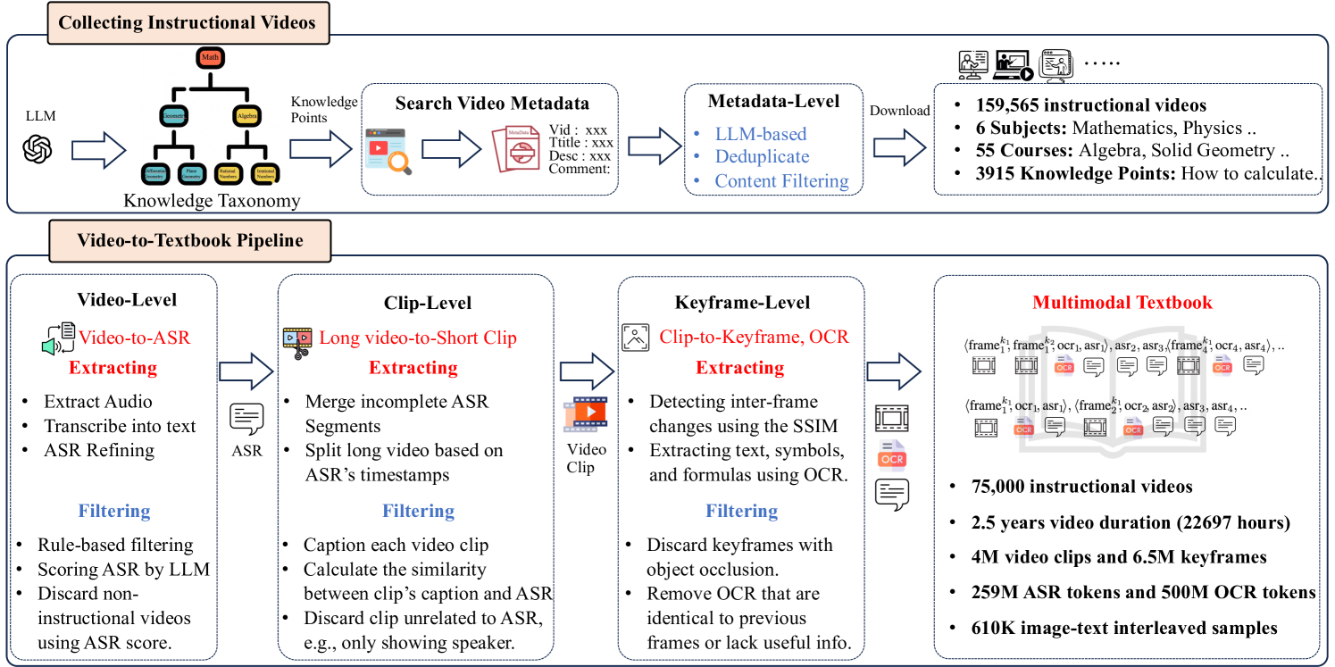 The dataset contains 6.5 million images and 800 million text data from teaching videos. All images and texts are extracted from online teaching videos (22,000 class hours), covering six basic subjects such as mathematics, physics, and chemistry, providing a more coherent background and richer knowledge for image-text alignment.