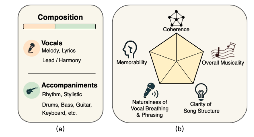 The dataset contains more than 2,399 songs (including vocals and accompaniment), and the data was annotated by 16 expert raters on five perceptual dimensions (overall coherence, memorability, naturalness of vocal breathing and phrases, clarity of song structure, and overall musicality). It covers approximately 140 hours of high-quality audio, including Chinese and English songs and 9 mainstream genres.