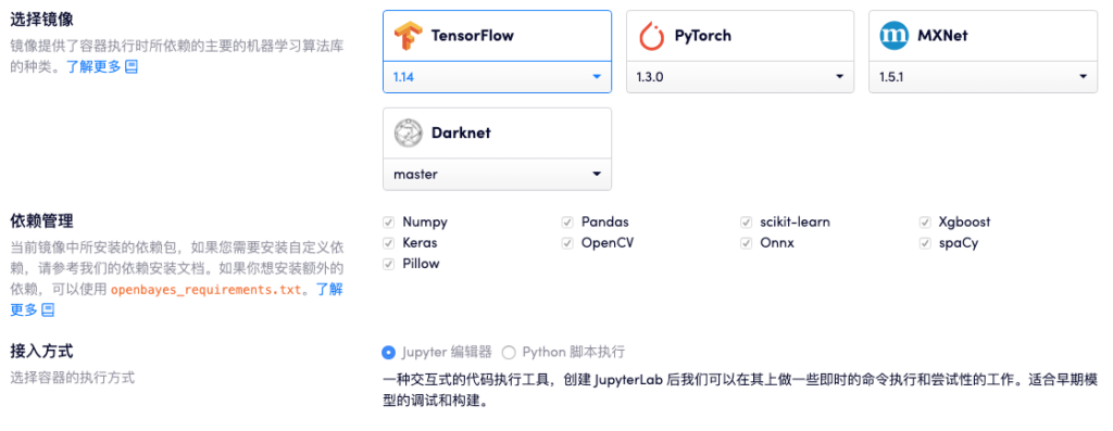 Currently, OpenBayes' computing power container products already support TensorFlow, PyTorch, MXNet  Standard machine learning frameworks of different versions and types and various common dependencies in CPU and GPU environments.