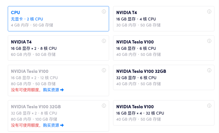 From CPU to T4 to V100, a wide range of computing container configurations