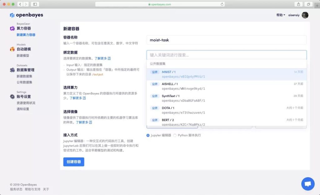 OpenBayes provides users with a variety of computing power container options