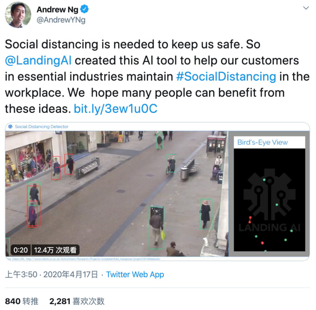 Reminding people to keep their distance in public places can effectively prevent cross-infection. Recently, Landing AI, a company founded by Andrew Ng, developed a tool that can measure the distance between pedestrians in real time from surveillance videos and give reminders when they exceed the safe distance.