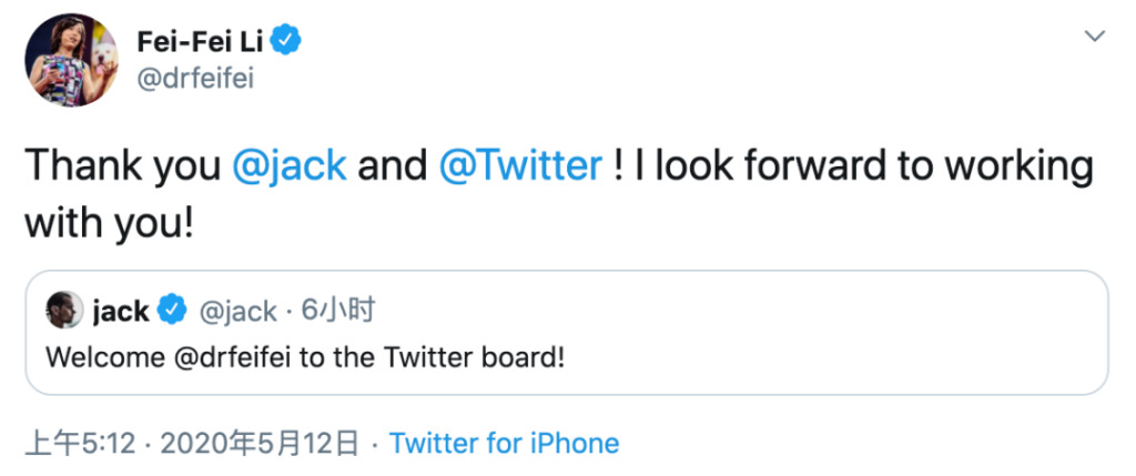 Yesterday, after Twitter CEO Jack Dorsey tweeted that Fei-Fei Li had joined Twitter, Fei-Fei Li retweeted the tweet and expressed her expectations for the new appointment.