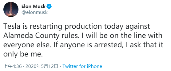 On May 10, Musk was dissatisfied with the local government's rejection of Tesla's application to resume work, so he filed a lawsuit against the Alameda County government in California and threatened to move Tesla out of California if it was not allowed to resume work.