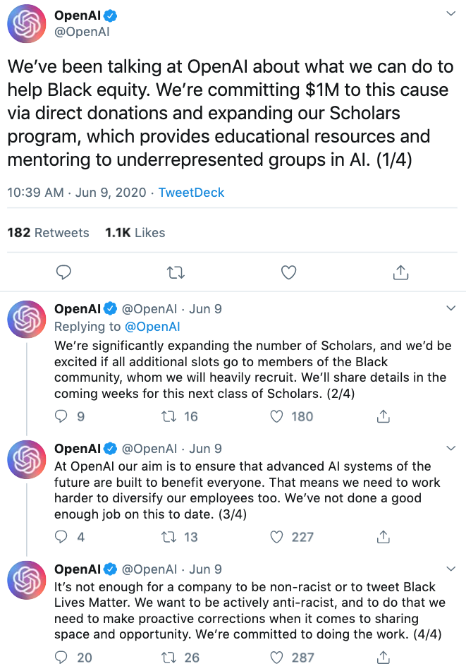 At OpenAI, we’ve been discussing what we can do to help black people achieve equality. Now, we’re announcing thatHelp will be provided through direct donations and expansion of our Scholars Program.