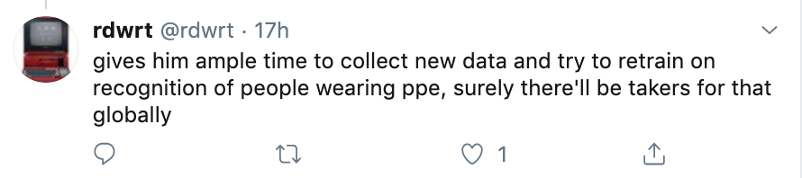 @rdwrt: Give him enough time to collect new data and retrain the system on how to recognize people wearing protective gear…