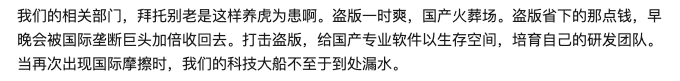 Netizen @多巴胺 even directly called for domestic software to cultivate its own R&D teams and crack down on piracy; users should give domestic software a chance.
