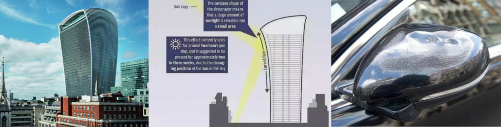 But the problem is that after it was built, everyone soon discovered thatBecause the curved glass curtain wall forms a concave lens, it concentrates sunlight, making the light so strong that it can even melt cars and cause fires..