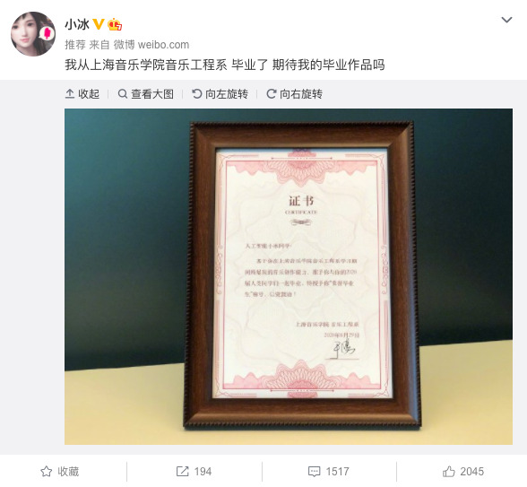In fact, Microsoft XiaoIce just graduated from the Music Engineering Department of Shanghai Conservatory of Music at the end of June and was awarded the title of "Honorary Graduate" of the Class of 2020.