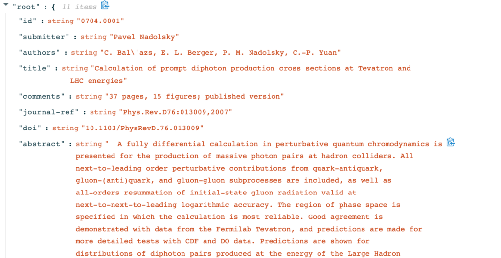 Currently, the arXiv dataset provides a metadata file in json format, which contains the relevant entries for each paper, as follows: