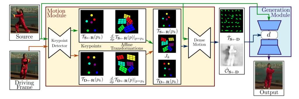 In general, the framework of the first-order motion model consists of two modules:Motion estimation module and image generation module.