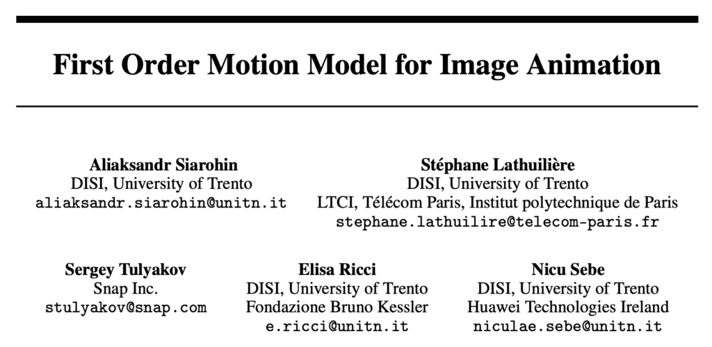 The first order motion model comes from a paper presented at the top conference NeurlPS 2019.First Order Motion Model for Image Animation,The authors are from the University of Trento in Italy and snap.