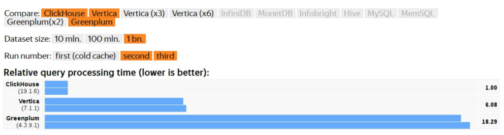 For example,With a dataset size of 100 million, ClickHouse's average response speed surpasses that of multiple OLAP open source engines.For example, it is 6.08 times that of Vertica, 18 times that of Greenplum, 126 times that of Hive, and 429 times that of MySQL.