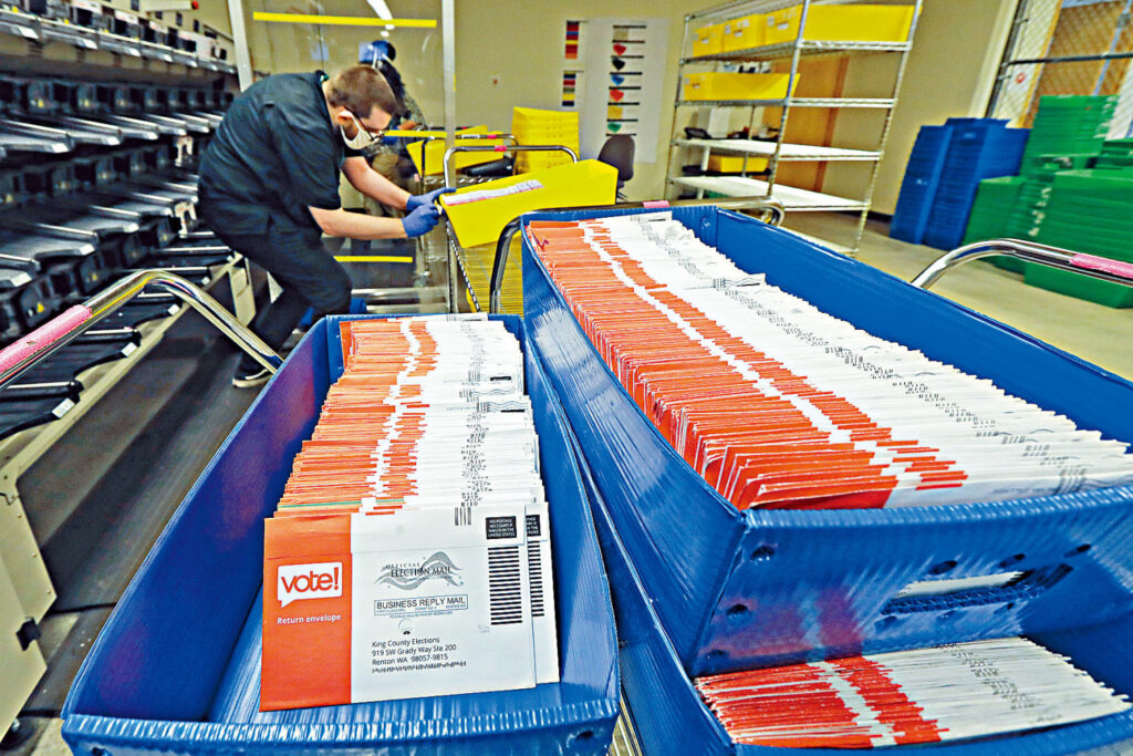 The picture shows voters putting paper ballots into mailboxes