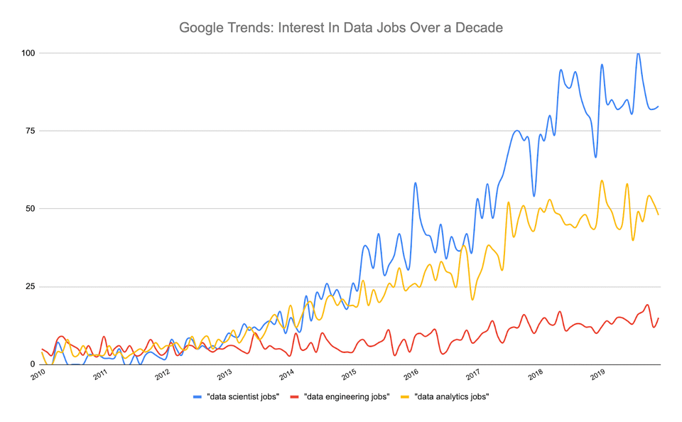 According to Google Trends, in the past decade,Interest in data scientist roles surges