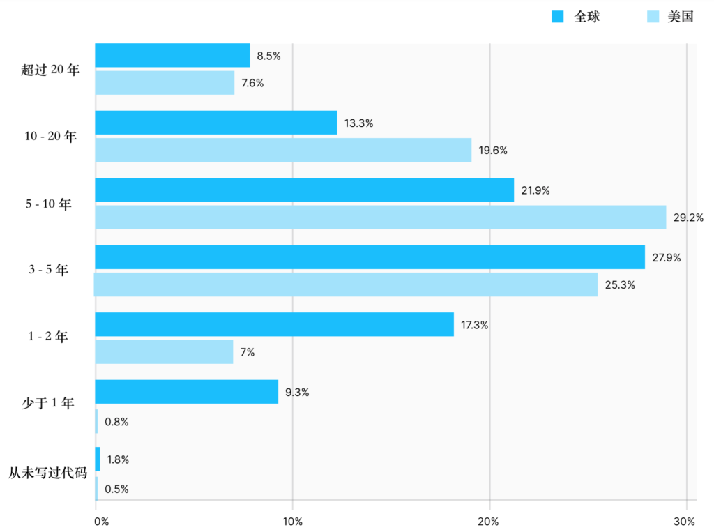 Globally, American data scientists have much more programming experience. In the United States, 37% people have been engaged in programming for more than 10 years, while globally, this proportion is only 22%.