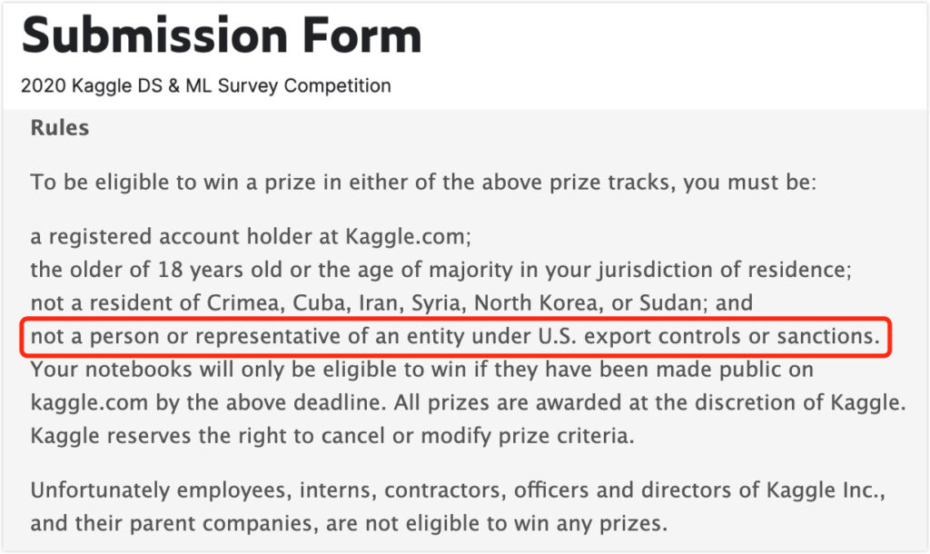 In other words, as long as your school or company is on the Entity List, you can fill out the questionnaire, but you cannot participate in the award review. Although there is no further background check or statement, Kaggle did refuse many Chinese people by name.